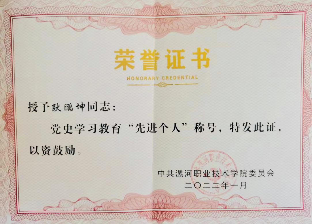 党史学习教育开展以来,我系在公司党委的正确领导下,按照“学党史、悟思想、办实事、开新局”的要求,采取多种方式深入学习,扎实开展一系列丰富多彩的党史学习教育活动和“我为群众办实事”实践活动,取得了明显成效。《中共best365官方网站登录入口委员会 关于表彰公司党史学习教育先进集体和先进个人的决定》(漯职公司党发[2022]5号)对先进集体和个人进行表彰,我系党总支荣获漯河职业技术公司党史学习教育先进集体,党总支书记耿鹏坤同志荣获漯河职业技术公司党史学习教育工作先进个人。