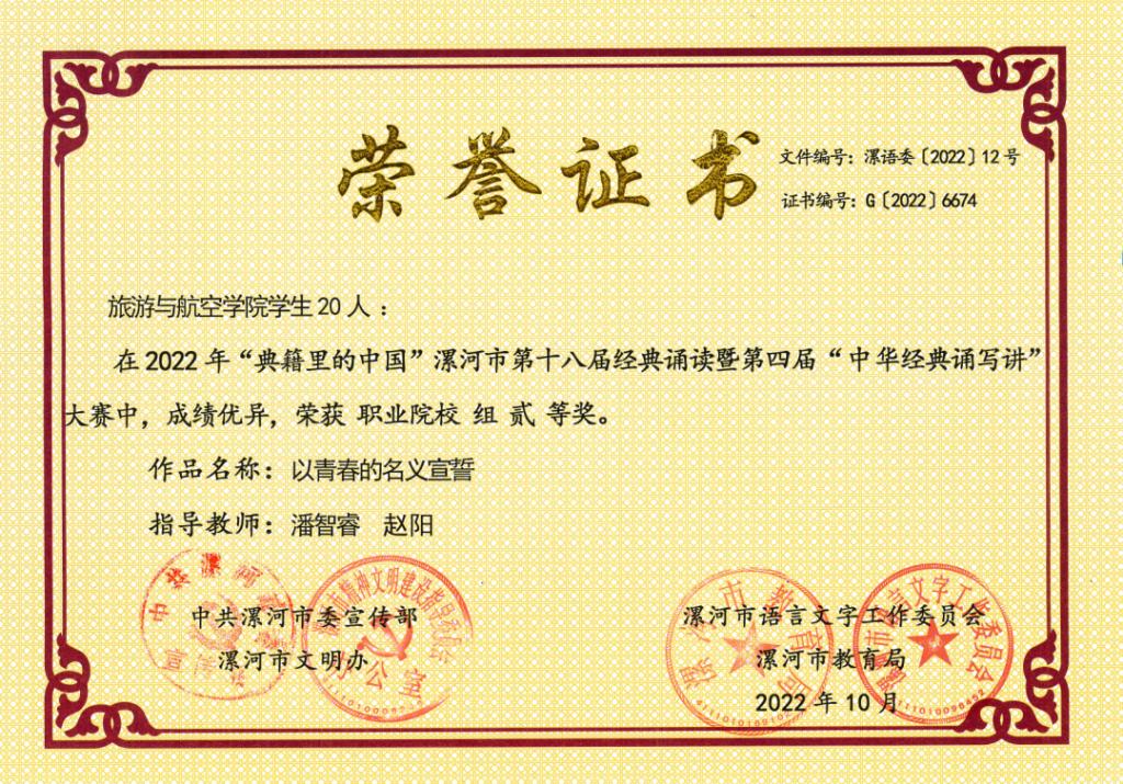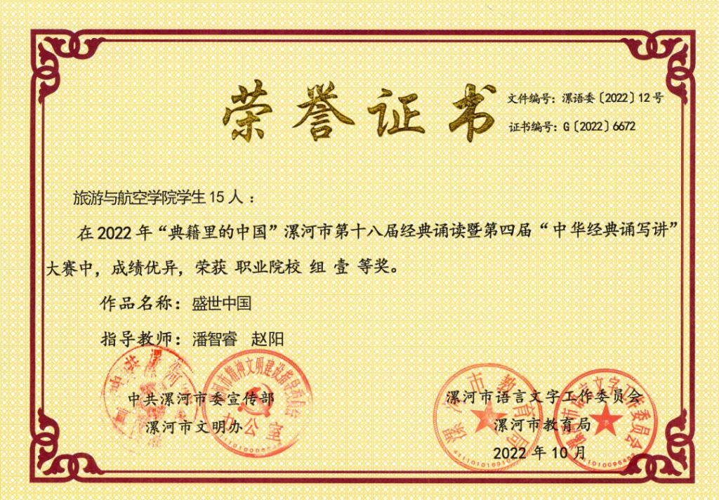 奋学乐教勤耕耘,桃李芬芳捷报传。近日,由中共漯河市委宣传部、漯河市文明办、漯河市语言工作委员会、漯河市教育局举办的2022年“典籍里的中国”漯河市第十八届经典诵读暨第四届“中华经典诵写讲”大赛落下帷幕。best365官方网站登录入口选送的原创朗诵作品《盛世中国》《以青春的名义宣誓》斩获职业院校组冠亚军,分获一二等奖,潘智睿、赵阳荣获最佳指导教师奖。