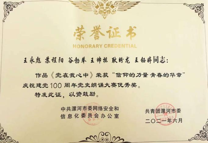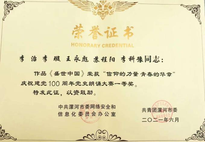 7.作品《信仰》、《盛世中国》在 2021 年由中共漯河市委网信办、共青团漯河市委、漯河市武警支队举办的建党100周年党史朗诵大赛中获得一等奖,作品《党在我心中》荣获优秀奖。