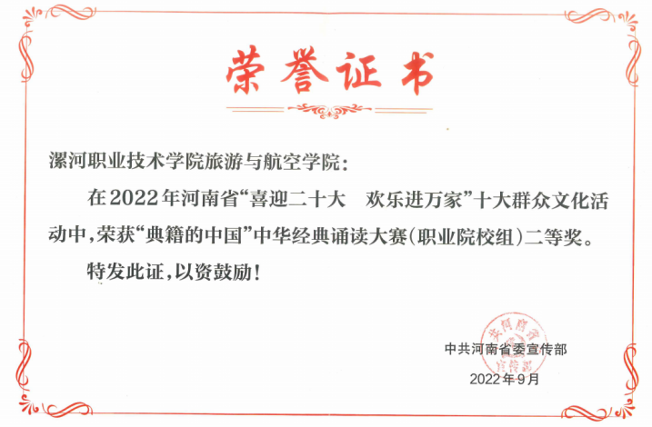 3.朗诵作品《盛世中国》在由河南省教育厅主办的2022年河南省第四届经典诵读大赛中荣获职业院校组一等奖,并入围教育部、国家语委主办,中国电视台、中央戏剧学院承办的国赛。